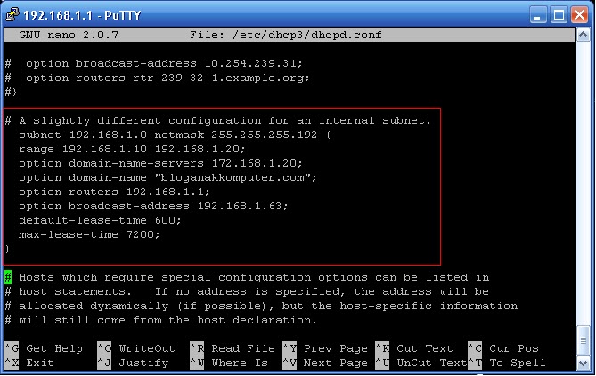 File konfigurasi dhcp3-server terletak di file /etc/dhcp3/dhcpd.conf. Gunakan editor nano untuk melakukan editing terhadap file konfigurasi tersebut. Sebelum melakukan konfigurasi DHCP Server, beberapa hal harus kita perhatikan diantaranya: